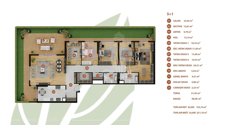 عدد الغرف والصالات : 4 + 1